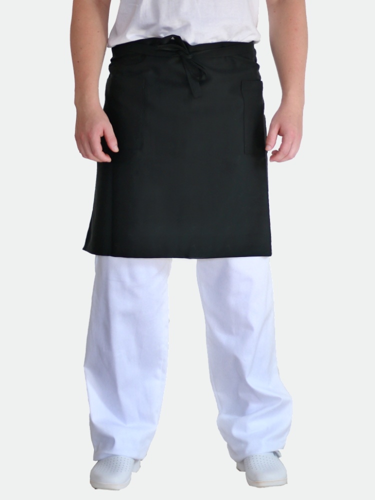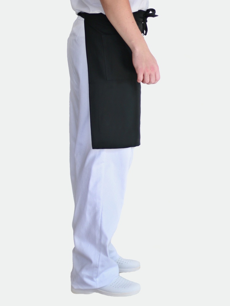 Malá černá zástěra do pasu (pasová zástěra) s kapsami a šitými vázačkami. Je vhodná jako kuchařská zástěra pro všechny kuchařky a kuchaře, ale najde využití i jinde.
