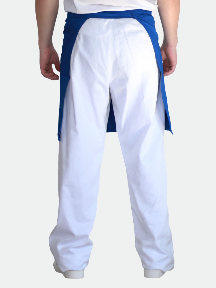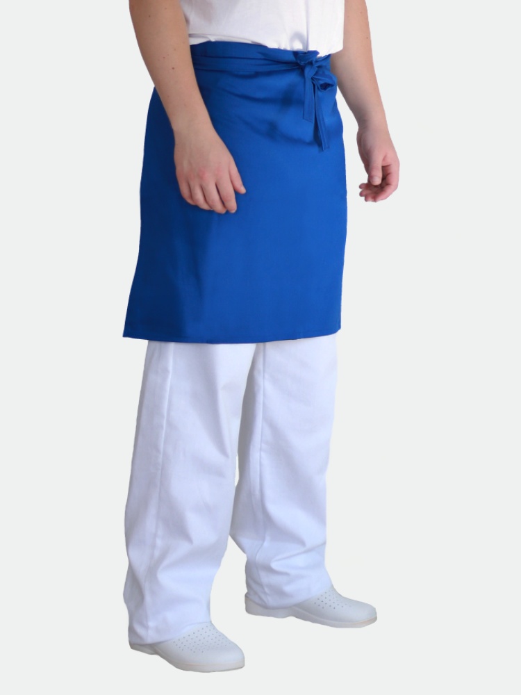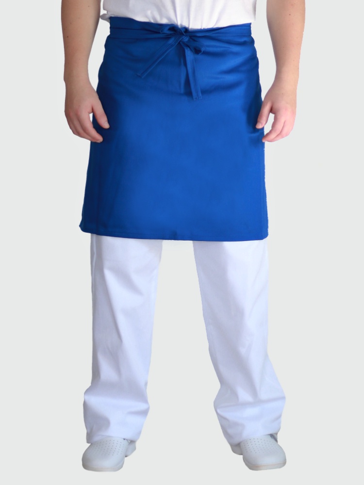 Malá modrá zástěra do pasu (pasová zástěra) s šitými vázačkami je vyrobena bez kapes. Je vhodná jako kuchařská zástěra pro všechny kuchařky a kuchaře, ale najde využití i jinde.
