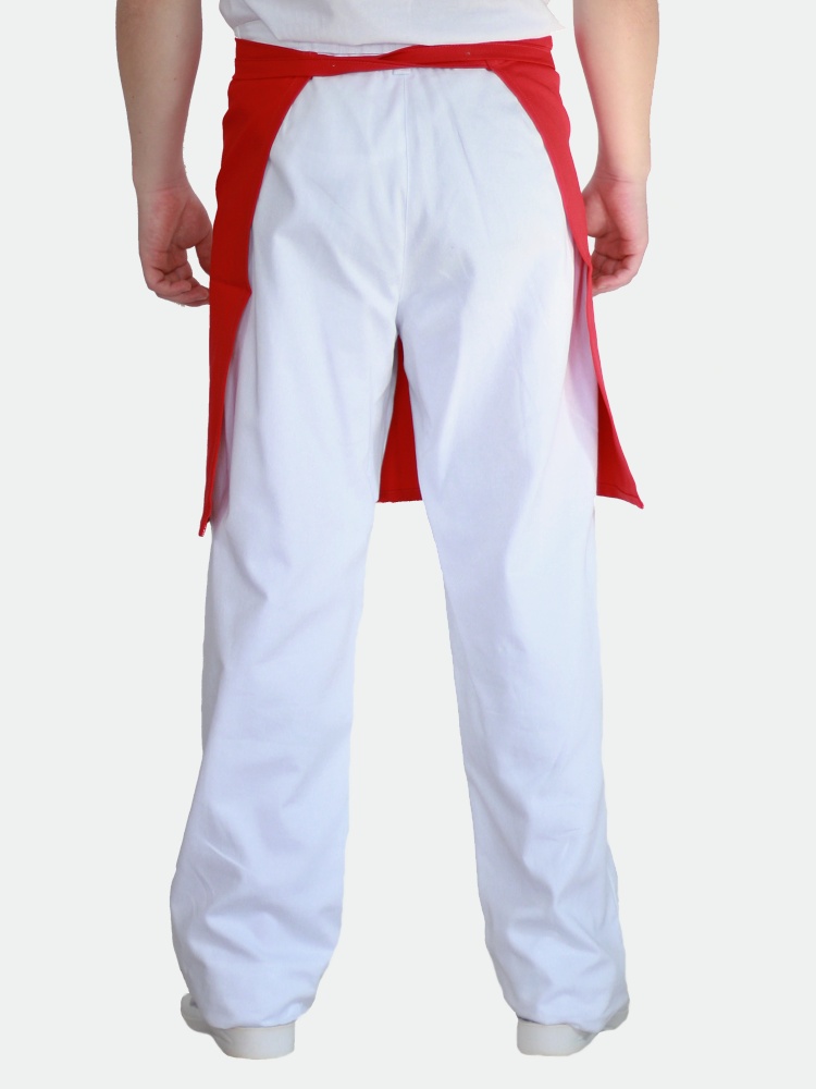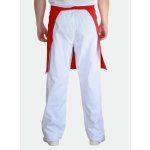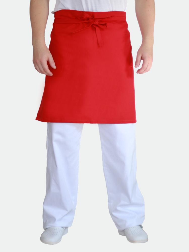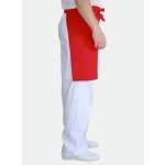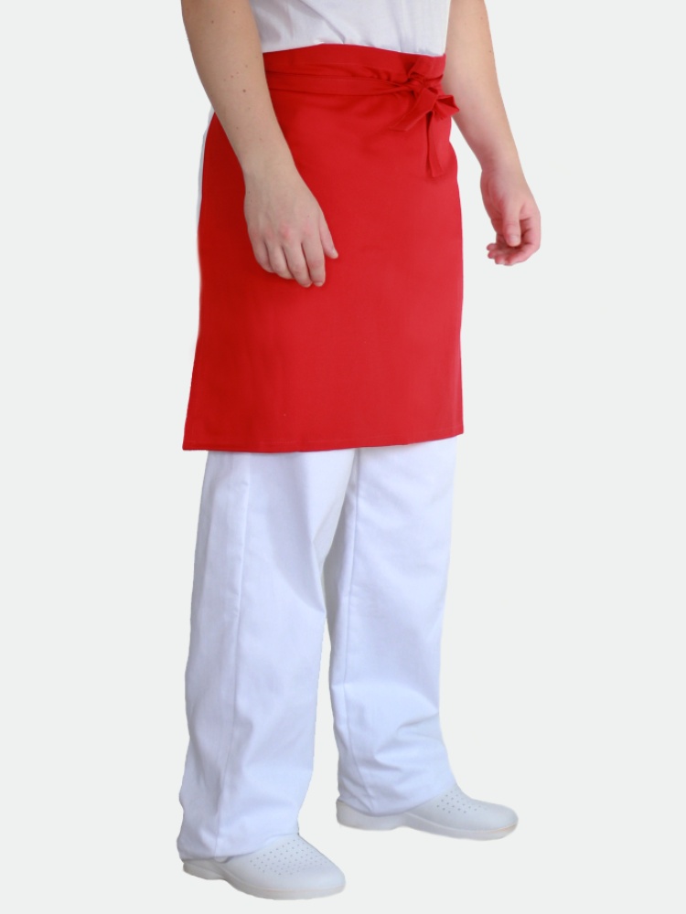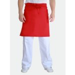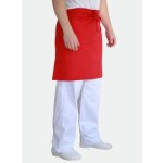 Malá červená zástěra do pasu (pasová zástěra) má šité vázačky a je vyrobena bez kapes. Je vhodná jako kuchařská zástěra pro všechny kuchařky a kuchaře, ale najde využití i jinde.