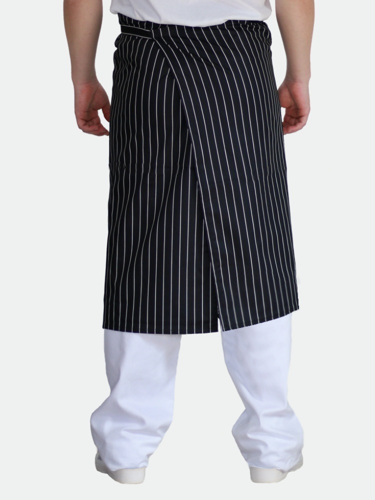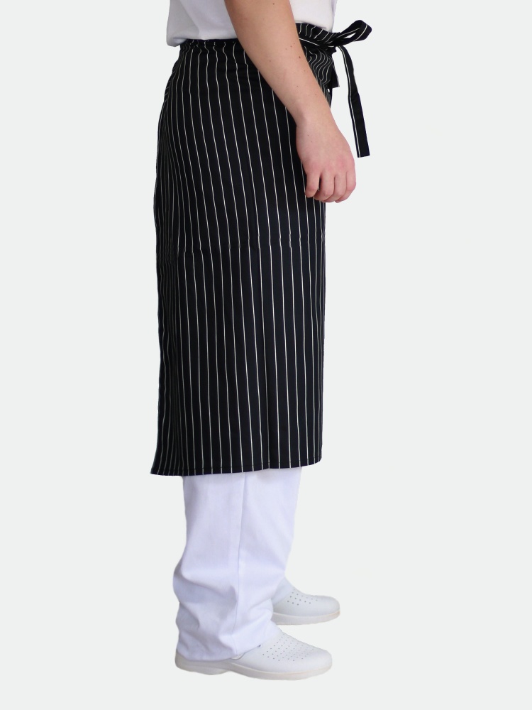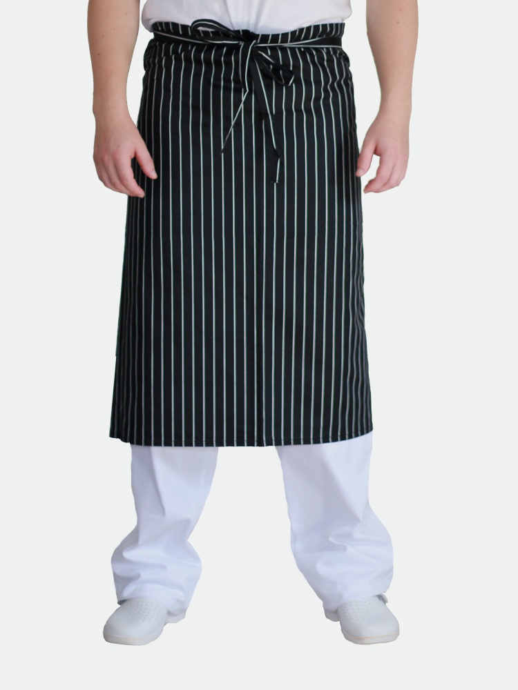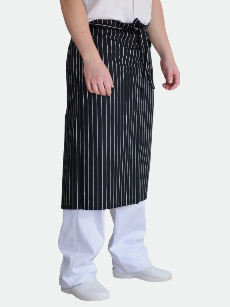 Velká zástěra do pasu (pasová zástěra) má černobílý pruh a šité vázačky. Je vhodná jako kuchařská zástěra pro všechny kuchařky a kuchaře, ale najde využití i jinde.