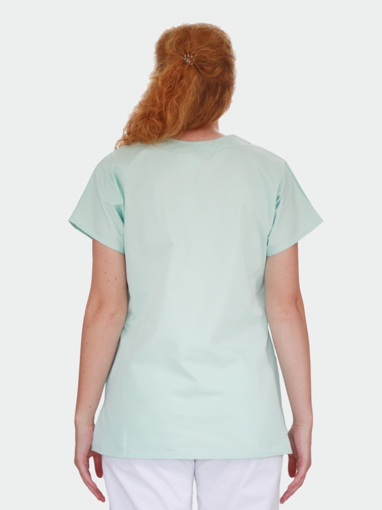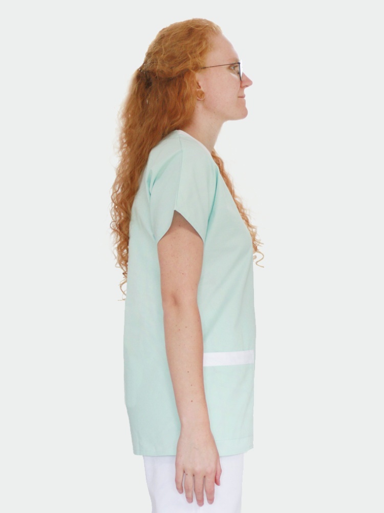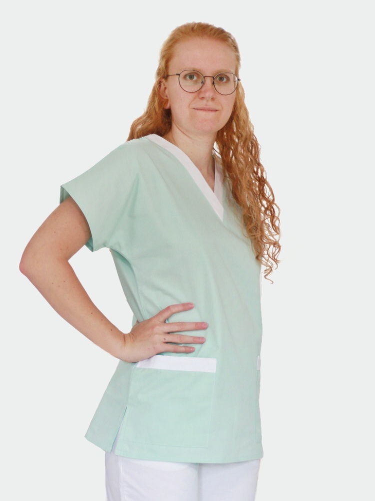 Halena dámská se spadenými rukávy v zelené barvě, výstřih do “V” a 2 kapsy spodní jsou bíle lemovány, náprsní kapsa je v barvě haleny.