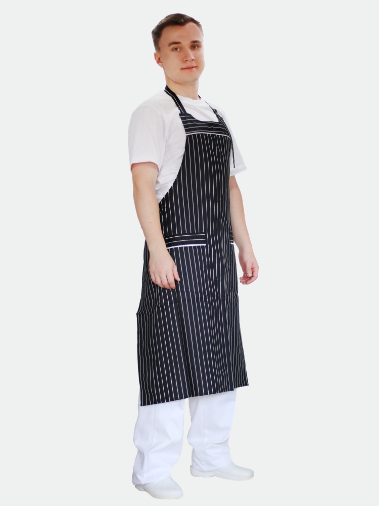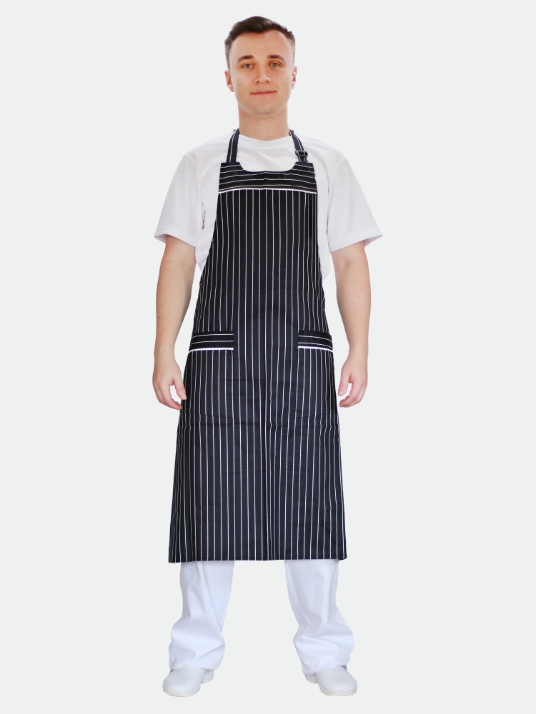zástěra s tvarovaným laclem, s plast. černou přezkou pro možnost úpravy vázačky za krk, 2 sešikmené kapsy