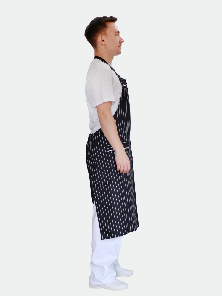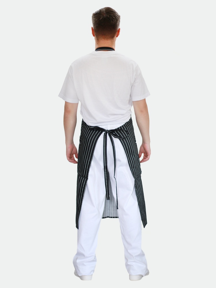 Laclová zástěra – černobílý pruh, bílé výpustky, 2 kapsy