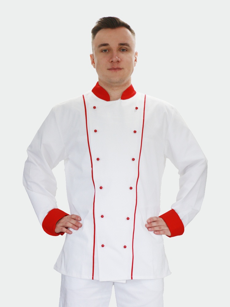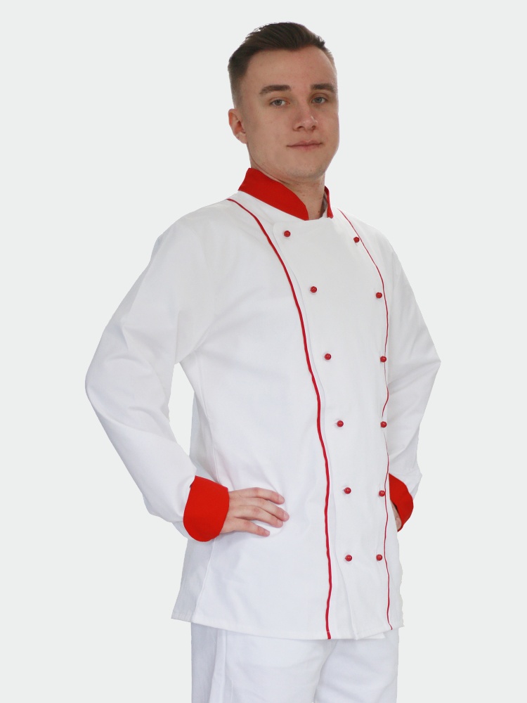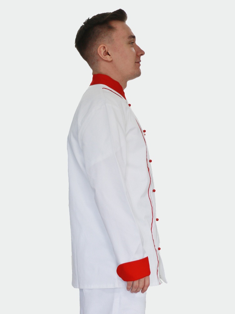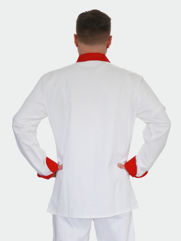 Pracovní kuchařský bílý rondon dvouřadý s červenými doplňky s dlouhým rukávem do manžety. Červené doplňky – stojáček, manžety, výpustky, knoflíky. Rondon je vyroben ze 100 % bavlněného materiálu pro příjemní nošení. Dvouřadé zapínání je na vyjímatelné plastové knoflíky v červené barvě.